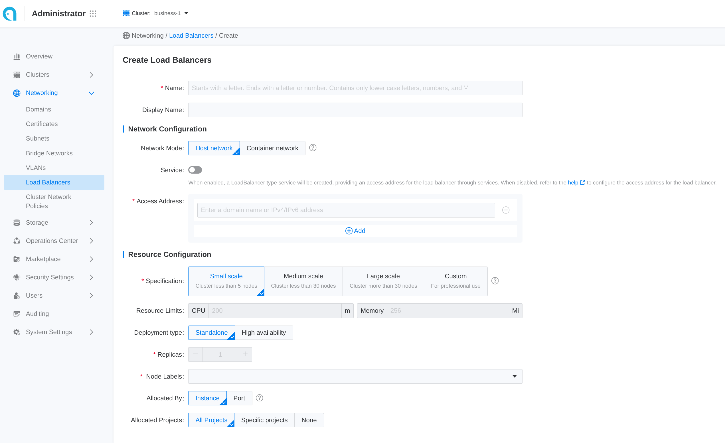 .spec.config.networkModestring: host or container, optional, default hostIn container mode, the operator creates a LoadBalancer Service and uses its address as the ALB address.