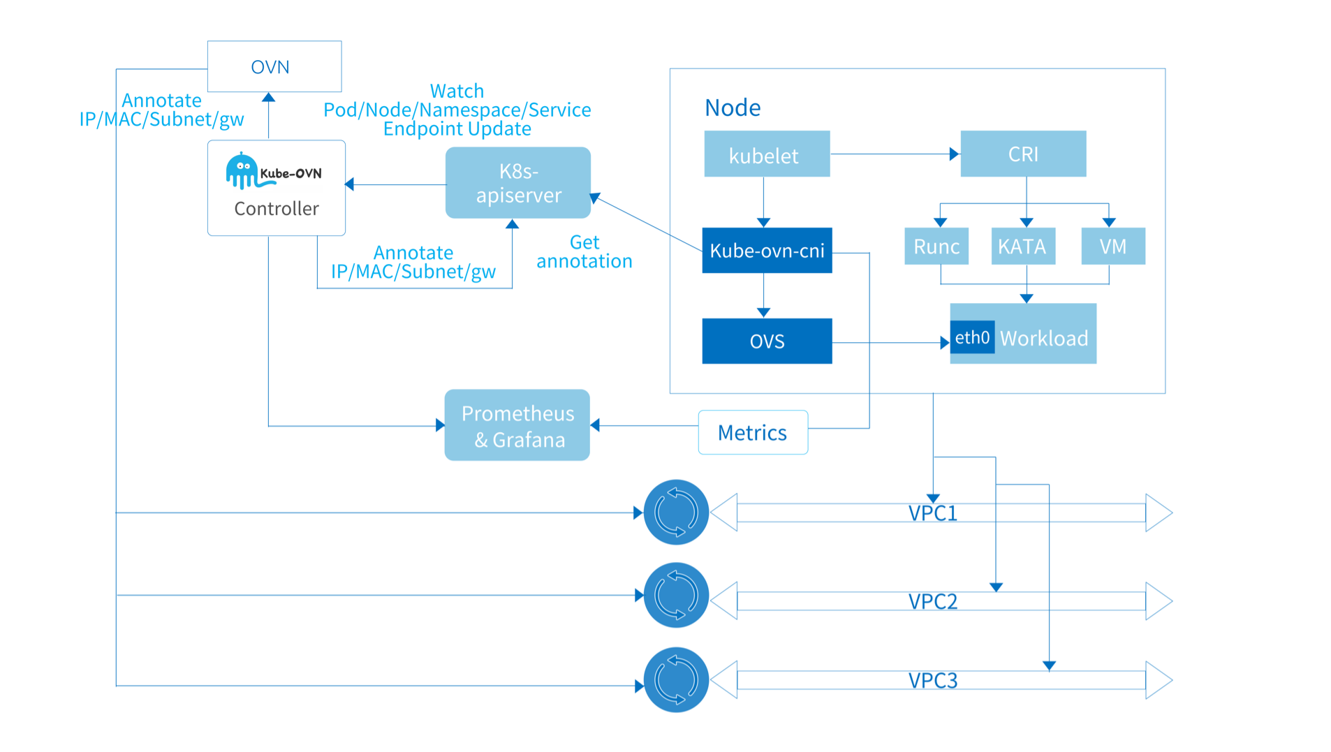 These components provide monitoring, diagnostics, operations tools, and external interface to extend the core network capabilities of Kube-OVN and simplify daily operations and maintenance.