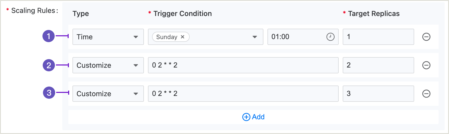- When multiple rules have the same trigger time (Examples 2 and 3), the platform will execute automatic scaling based only on the rule that is higher in priority (Example 2).